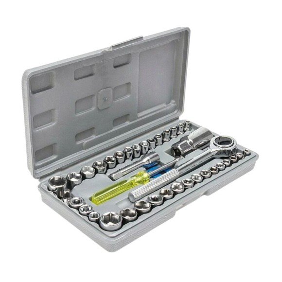 Jogo de soquete com 40 peças em estojo organizador. Ferramentas em aço cromo vanádio, ideais para reparos mecânicos e domésticos.